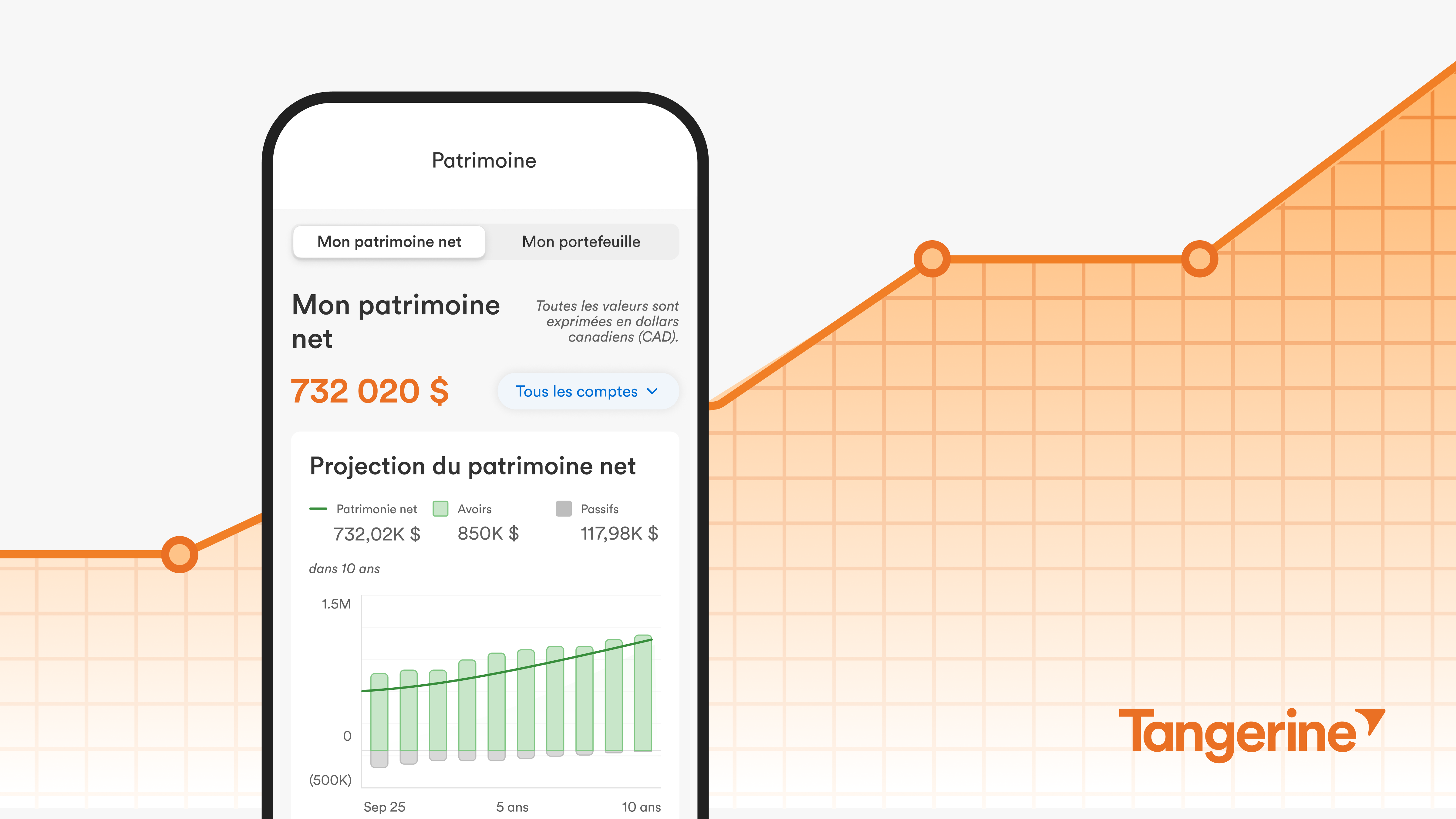 Intégrée directement à l’application mobile Tangerine, la nouvelle fonctionnalité de gestion de patrimoine permet aux clients et clientes de regrouper leurs avoirs, leurs passifs, la répartition de leur portefeuille et les tendances de rendement dans une seule vue d’ensemble. Grâce à un portrait financier plus clair, ils peuvent mieux voir où ils en sont et vers quoi ils se dirigent, ce qui leur permet d’aller de l’avant en toute confiance.